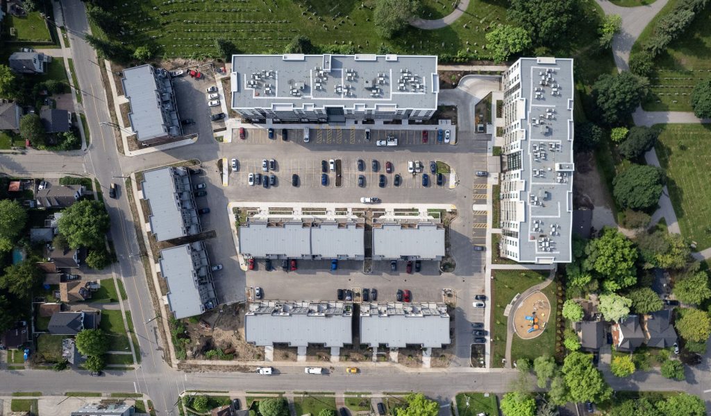 The Spur Line Common Brownfield redevelopment is located on the former Ontario Die Company (ODC) site at the intersection of Roger Street and Moore Avenue. The project’s vision was developed through consultations with the City of Waterloo, residents, and the ODC family owners. The completed development features 248 residential units, including two six-story mid-rise buildings and 68 stacked townhomes. The community is complemented by public amenities, including a park, a corner parkette, and pedestrian pathways that connect seamlessly with surrounding neighbourhoods and King Street.