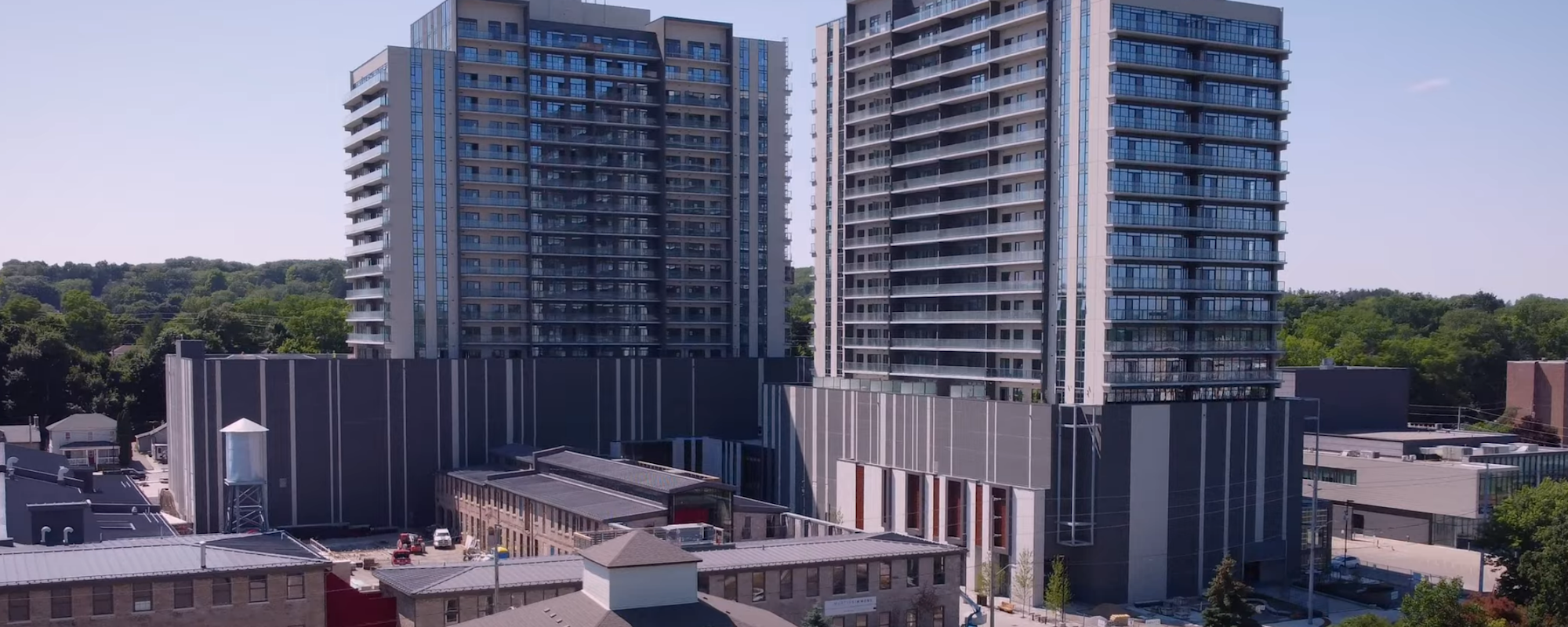 Situated in Uptown Waterloo, Circa 1877 is a total precast condominium with ties to Waterloo’s past. Having previously been home to one of Canada’s first craft brewers from 1984 to 2015, the site has been granted heritage status. The 20-storey tower includes six parking levels, 14 residential levels, one mechanical penthouse level, street-level retail and a second-floor urban brew pub with a patio.
